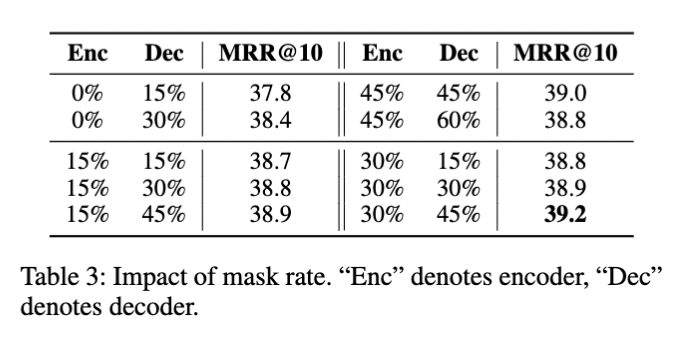 마스크 비율이 사전 훈련에 도움이 될 수 있다는 것을 고려하여, CoT-MAE의 인코더와 디코더 각각에 최대 30% 및 45%의 마스크 비율을 채택합니다. 디코더 측에서 더 큰 마스크 비율은 컨텍스트 지도 가려진 자기 부호화의 어려움을 더욱 증가시키고, 인코더 측이 더 강력한 텍스트 인코딩 능력을 습득하도록 합니다.