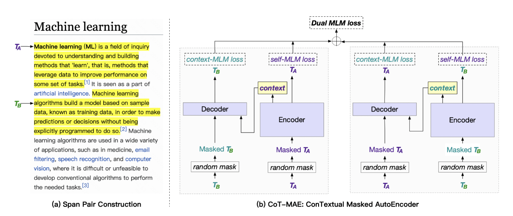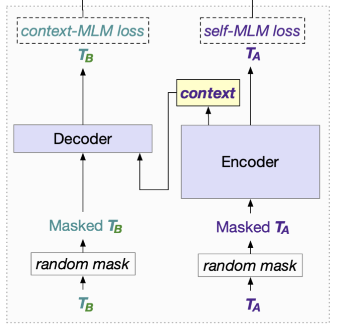 $T_A$와 $T_B$에 마스킹을 하고, 마스킹된 텍스트를 인코더에 넣어 원래 텍스트를 재구성 (MLM)